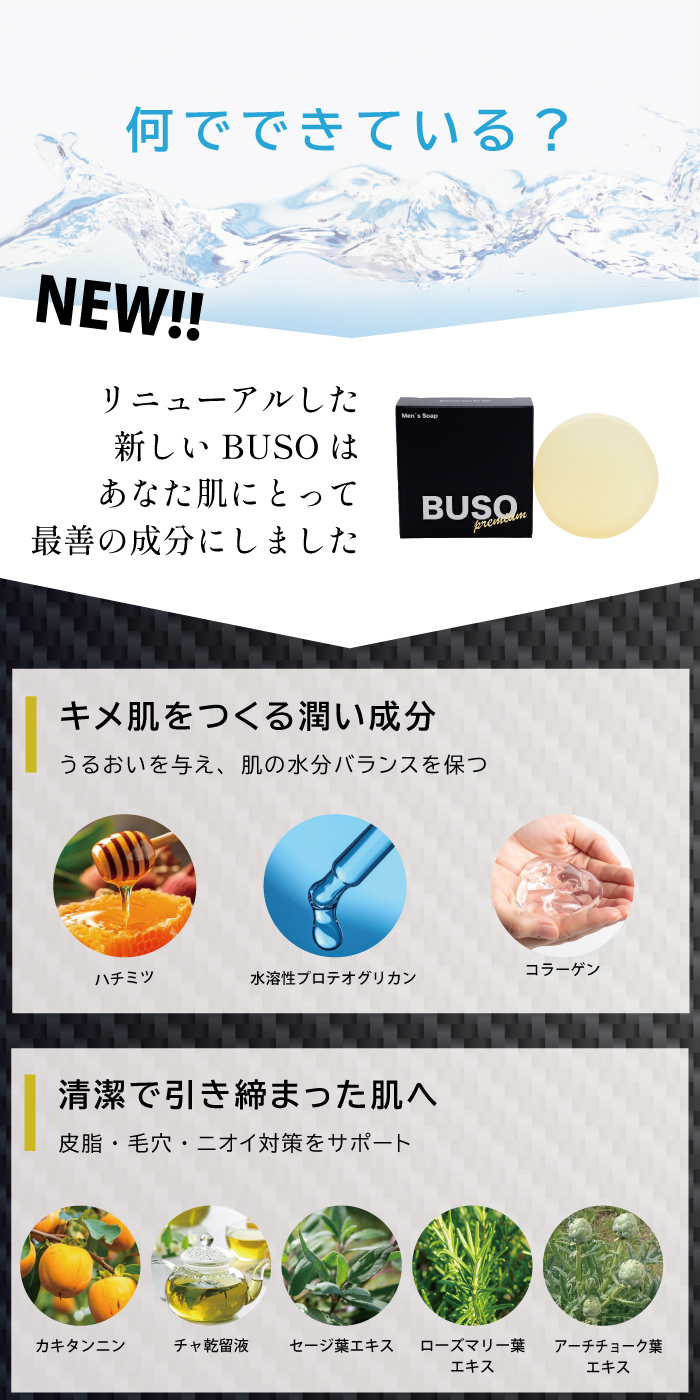 BUSO洗顔石けんは、「無添加」枠練り石けんのキメの細かい弾力性のある泡が、毛穴の奥に入り込んでいる汚れに吸着し余分な皮脂や汚れを洗浄します。